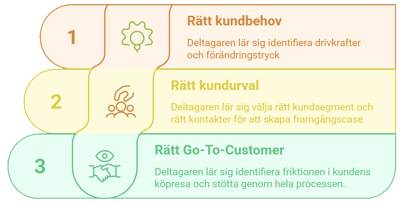 Första dagen lägger vi grunden. Du får verktyg för att förstå kundens verkliga behov, även när de själva inte ser det.